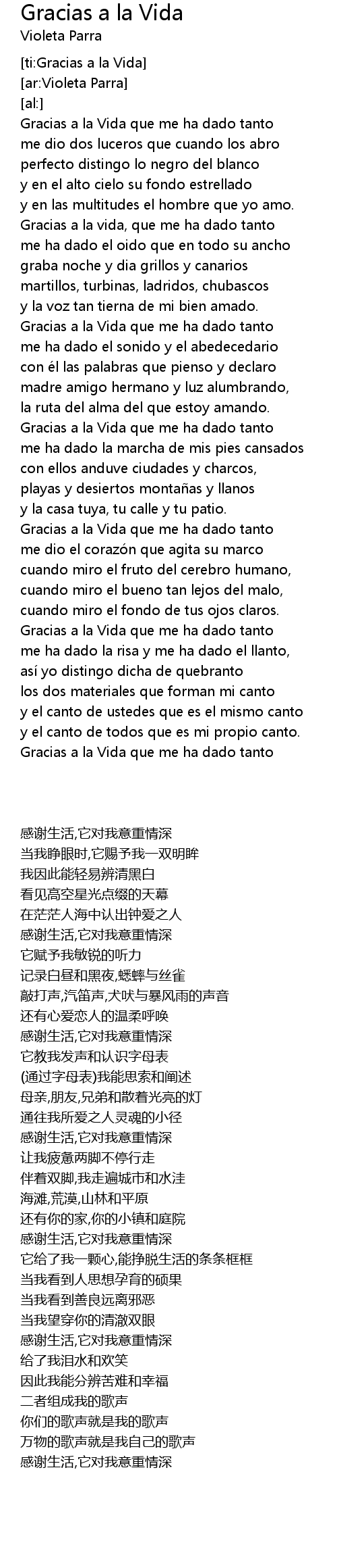 | [02:49.73] | Gracias a la Vida que me ha dado tanto |