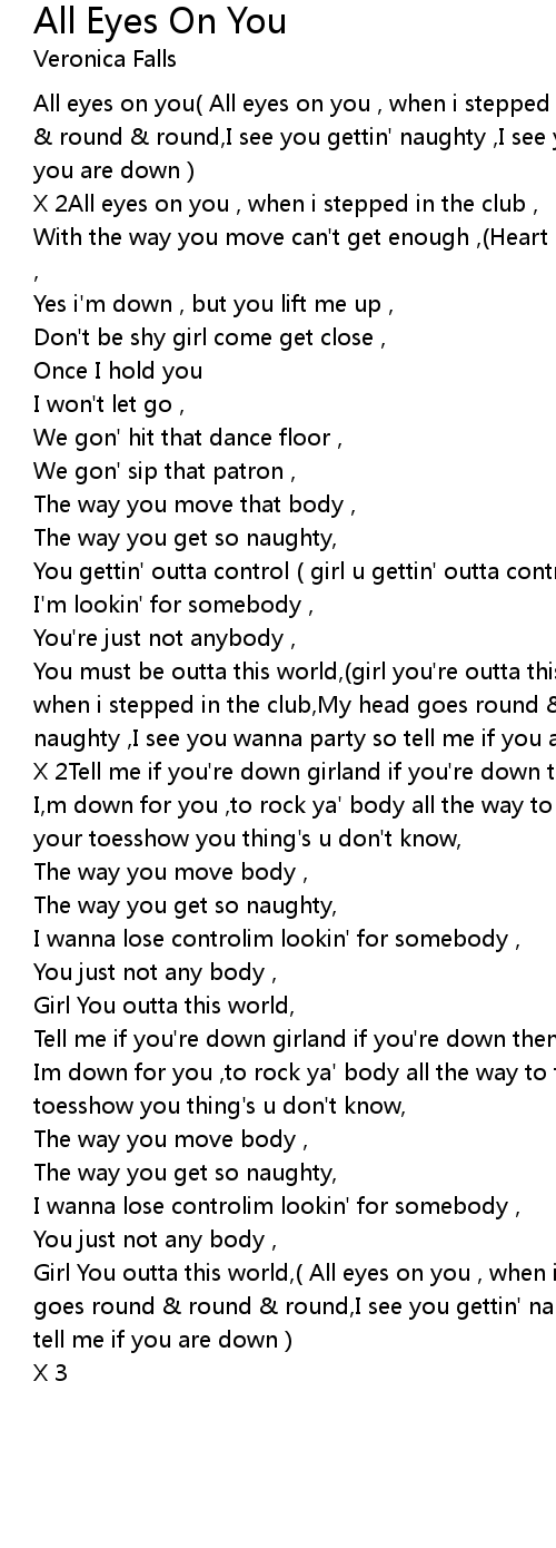 All eyes on you( All eyes on you , when i stepped in the club,My head goes round & round & round,I see you gettin' naughty ,I see you wanna party so tell me if you are down ) |