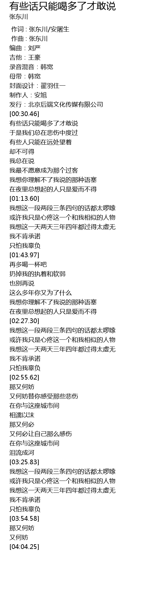| [00:30.91] | yǒu xiē huà zhǐ néng hē duō le cái gǎn shuō |