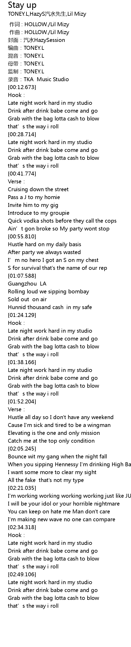 | [02:11.008] | When you sipping Hennessy I' m drinking High Ball |
