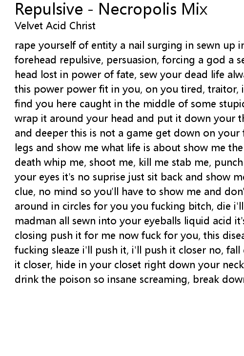 rape yourself of entity a nail surging in sewn up in powers sew it in your forehead repulsive, persuasion, forcing a god a sea of traitors, bleed into my head lost in power of fate, sew your dead life always goes no sacrifice, no it's this power power fit in you, on you tired, traitor, insane a purple day so i find you here caught in the middle of some stupid vice shooting your arms and wrap it around your head and put it down your throat deeper and deeper deeper and deeper this is not a game get down on your four legs get down on your four legs and show me what life is about show me the truth show me life and show me death whip me, shoot me, kill me stab me, punch me put it in my hair put it in your eyes it's no suprise just sit back and show me what life is about i have no clue, no mind so you'll have to show me and don't waste my time i will not jump around in circles for you you fucking bitch, die i'll show you a psychopathic madman all sewn into your eyeballs liquid acid it's a broken form of disease no closing push it for me now fuck for you, this disease i'll fuck, i'll kill you, fucking sleaze i'll push it, i'll push it closer no, fall down forever i'll push it closer, hide in your closet right down your neck, now freezing, freezing drink the poison so insane screaming, break down |
