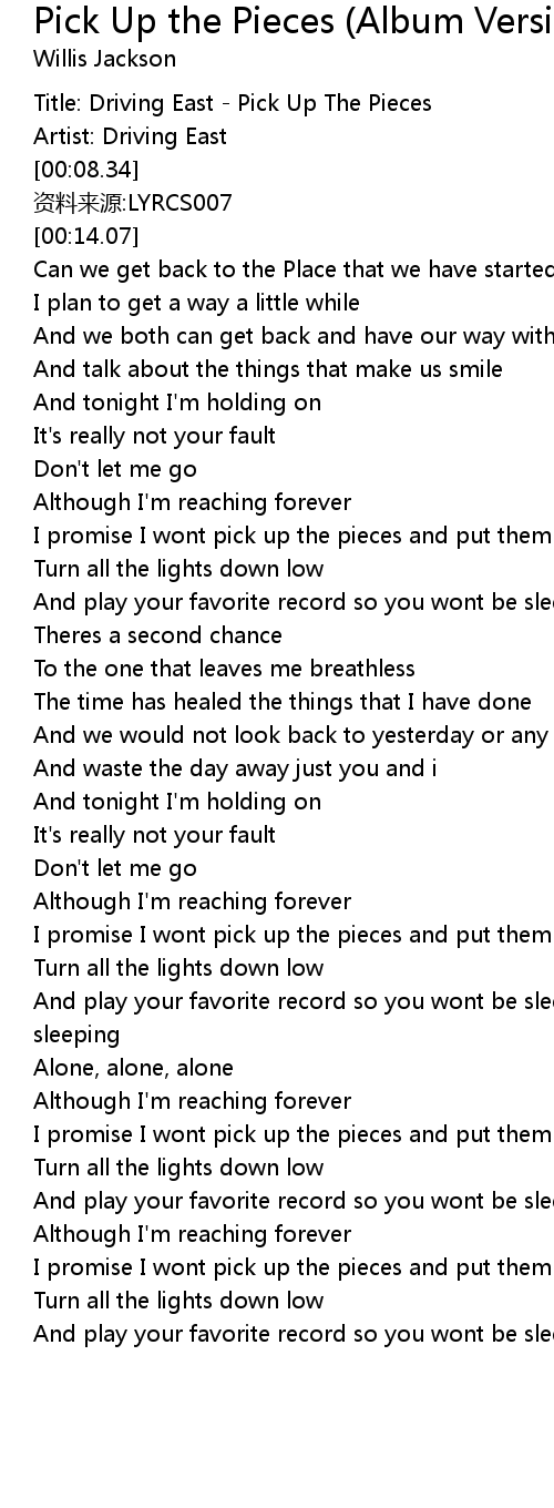 | [00:00.00] | Title: Driving East Pick Up The Pieces |