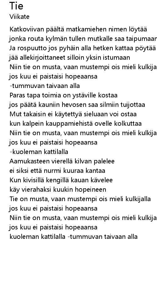 | Niin tie on musta, vaan mustempi ois mieli kulkijalla | |