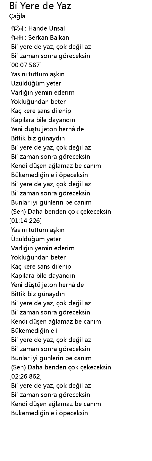 | [00:00.441] | Bi' yere de yaz, çok değil az |