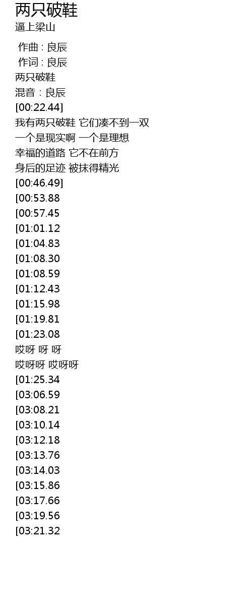 | [01:55.70][00:53.88] | 我那两只破鞋 在脚上直逛荡 |