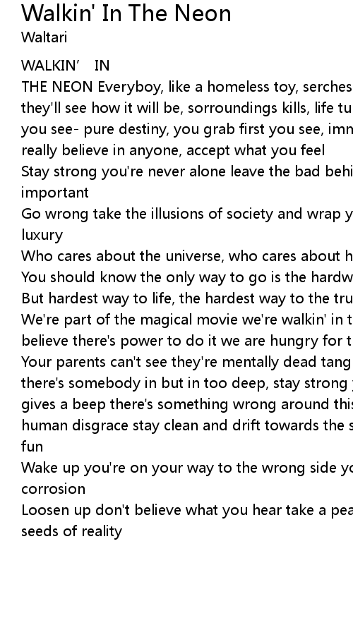 | We're part of the magical movie we're walkin' in the neon (trancevision) we believe there's power to do it we are hungry for the real life | |