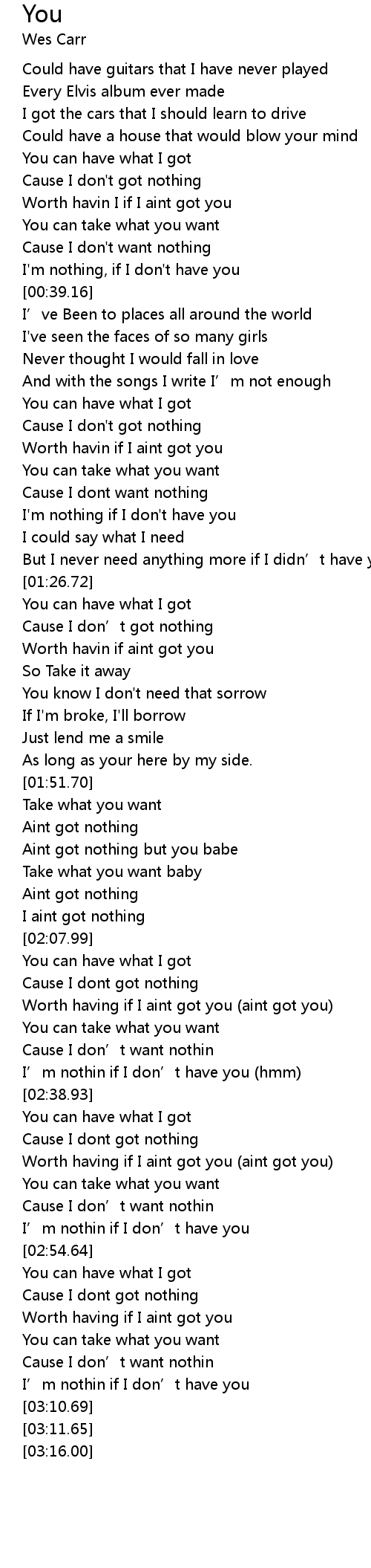 | [02:57.46] | Cause I dont got nothing |