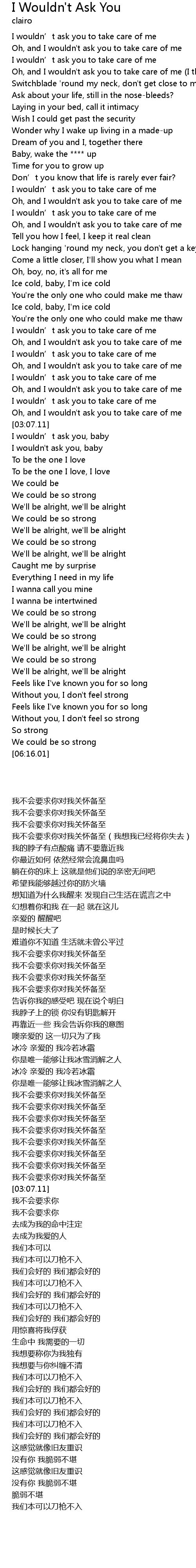 | [03:00.76] | Oh, and I wouldn' t ask you to take care of me |