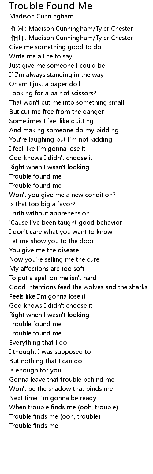 | [03:01.094] | When trouble finds me ooh, trouble |