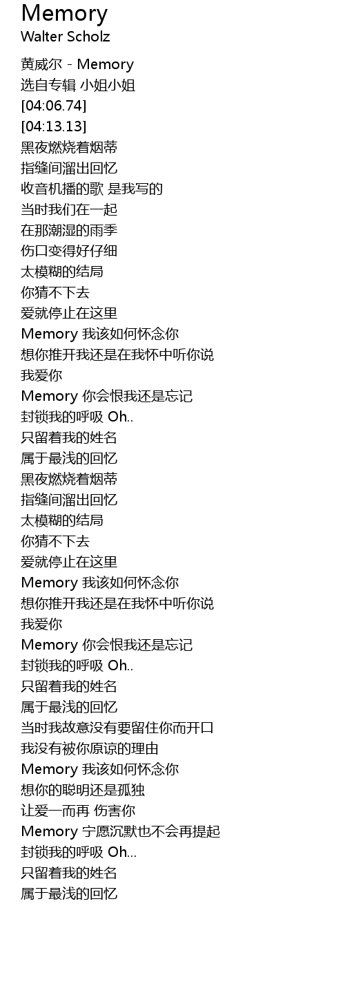 | [02:31.45] | Memory 你会恨我还是忘记 |