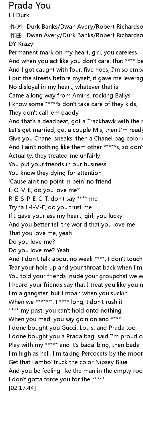 | [01:58.45] | I done bought you a Prada bag, said I'm proud of you |