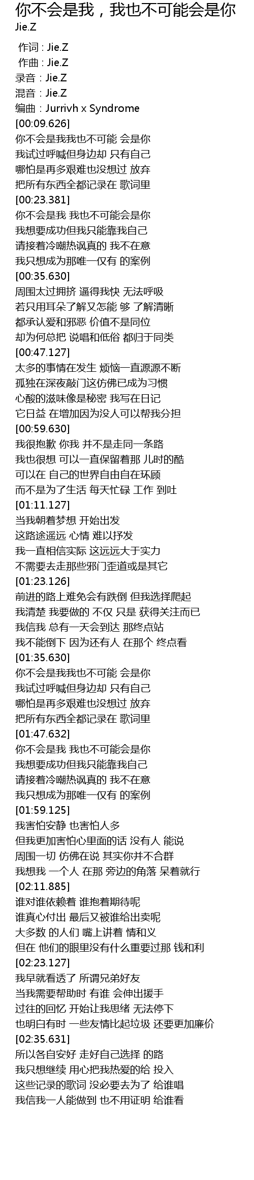 | [00:23.631] | nǐ bú huì shì wǒ wǒ yě bù kě néng huì shì nǐ |