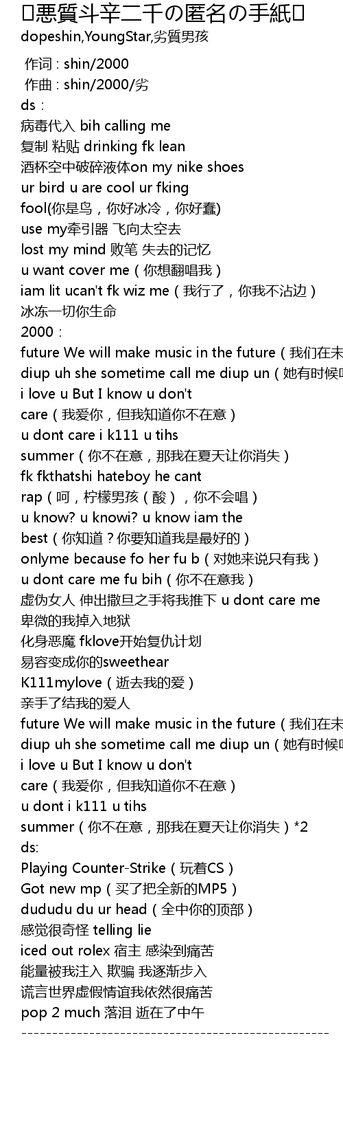 | [01:25.220] | fk fkthatshi hateboy he cant rap ā, níng méng nán hái suān, nǐ bú huì chàng |