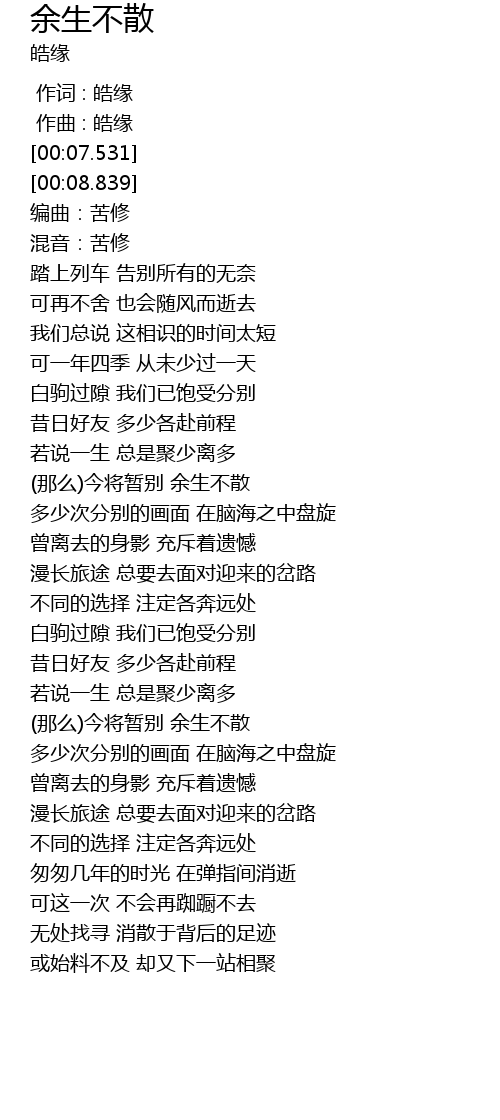 | [03:19.736] | (那么)今将暂别 余生不散 |