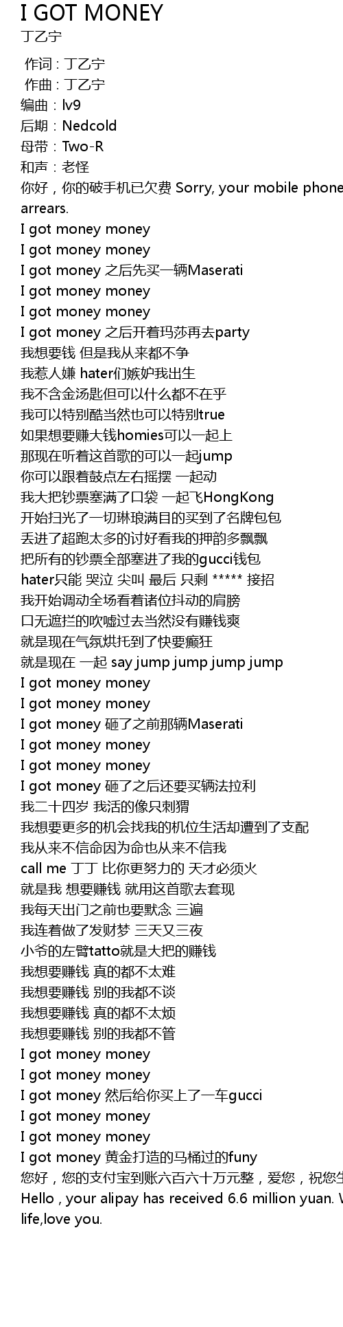 | [02:17.613] | I got money huang jin da zao de ma tong guo de funy |