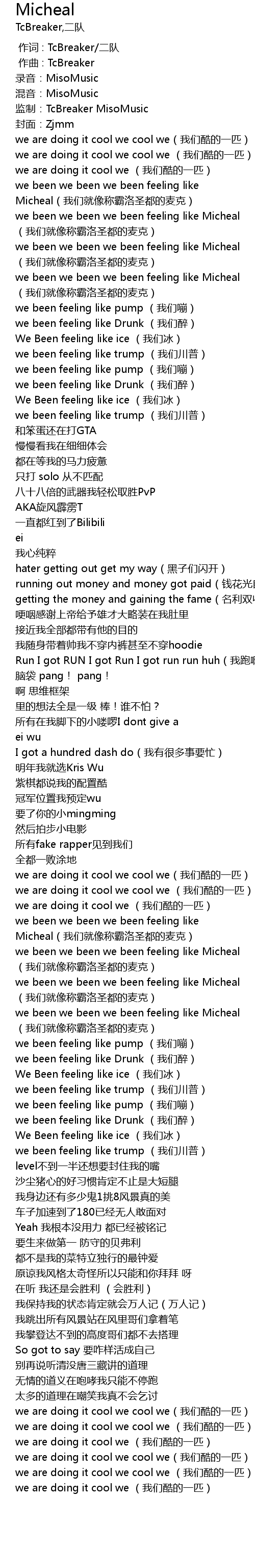 | [01:55.872] | we been we been we been feeling like Micheal wǒ men jiù xiàng chēng bà luò shèng dōu de mài kè |