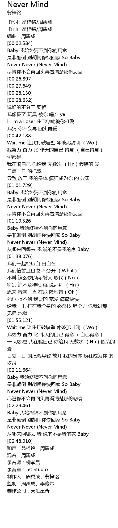 | [02:11.914] | Baby 我始终猜不到你的用意 |
