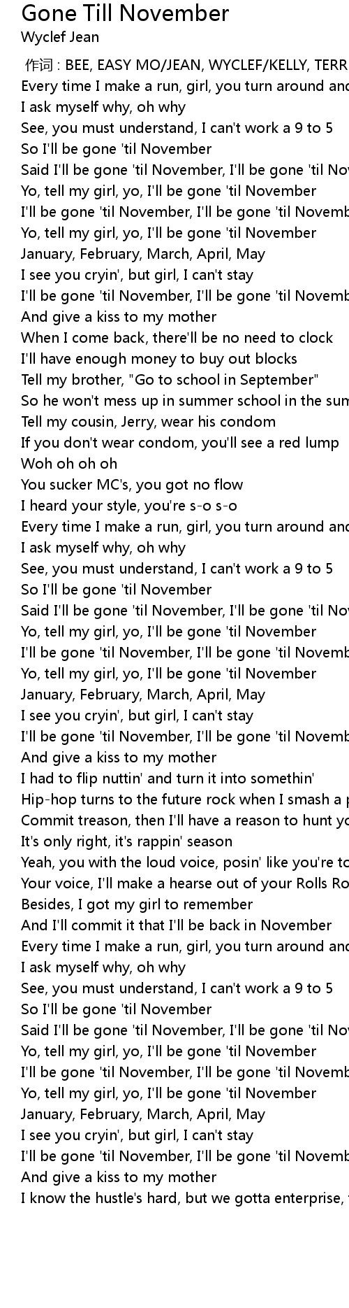 | [02:55.86] | Yo, tell my girl, yo, I'll be gone 'til November |