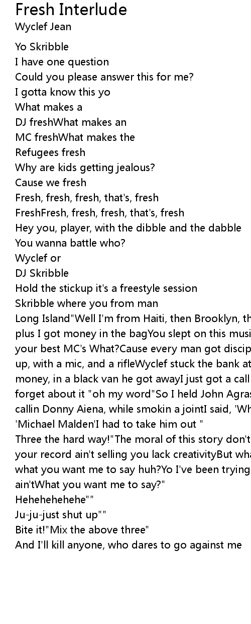 Long Island"Well I'm from Haiti, then Brooklyn, then JerseyWith a universal tag, plus I got money in the bagYou slept on this musician, plus the hip-hop artBring your best MC's What?Cause every man got disciples if you ever want a rivalShow up, with a mic, and a rifleWyclef stuck the bank at mid-dayAnd took all of Sony money, in a black van he got awayI just got a call from Tommy MottolaHe said forget about it "oh my word"So I held John Agrassia, at gunpointHe's shook, callin Donny Aiena, while smokin a jointI said, 'Who's the informer?' They say, 'Michael Malden'I had to take him out " |