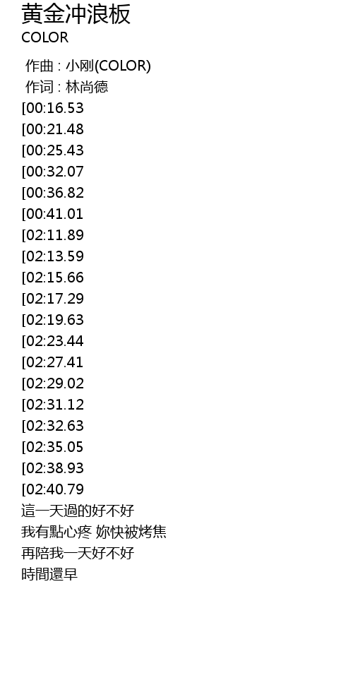 | [03:17.73][02:23.44][01:00.28] | 踩著我的黃金衝浪板 |