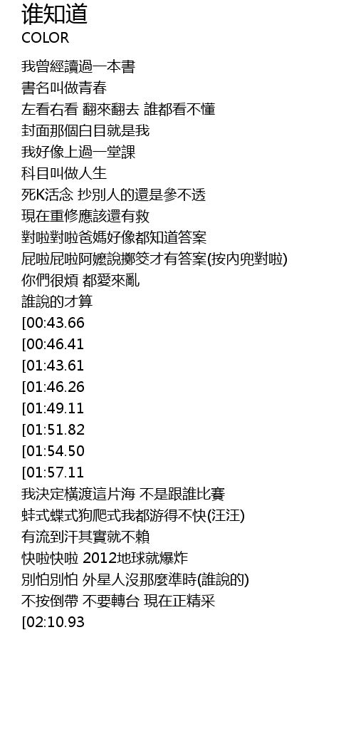 | [02:32.77][02:10.93] | 誰知道誰知道 |