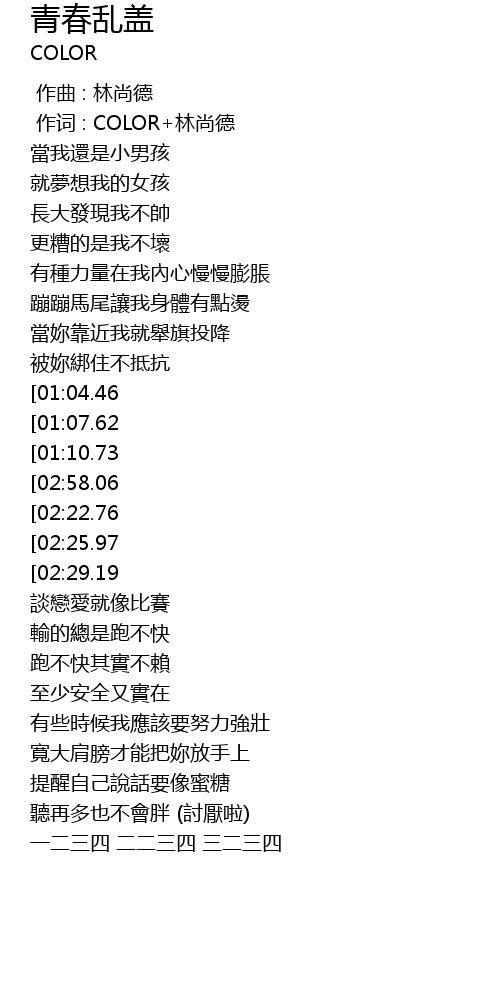 | [03:10.81][02:58.06][02:32.36][02:19.60][01:26.83][01:13.97] | 青春亂蓋 |