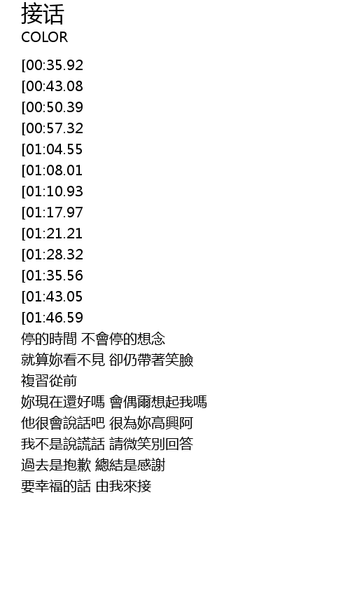 | [03:12.24][01:35.56] | 我不想再接話 反正妳有了他 |