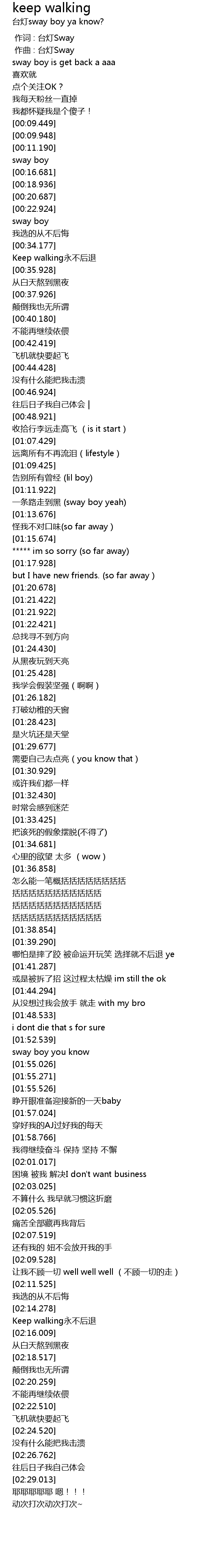 | [01:12.924] | 一条路走到黑 (sway boy yeah) |