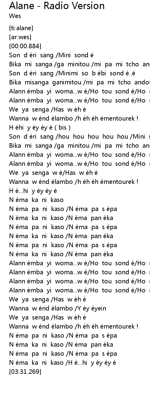 | [02:57.867] | Alann é mba yi woma... w é Ho tou sond é Ho ma... y é |