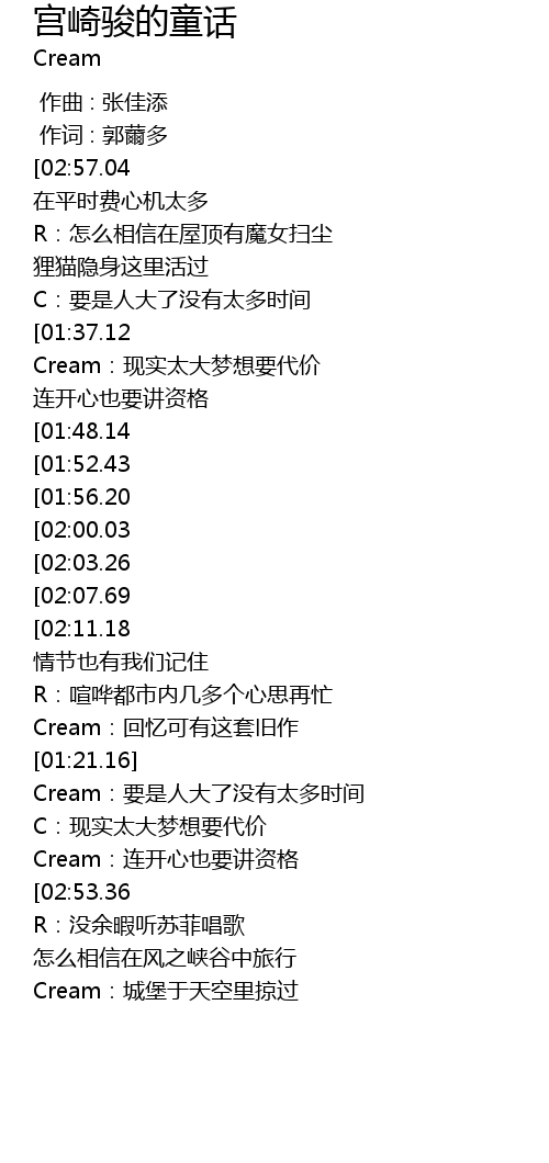 | [00:38.45][01:48.14][02:26.21] | Cream: ming ming shi ting dao mao ba shi ban ye hu jiao |