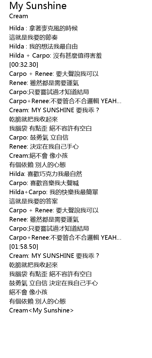 | [01:59.78] | Cream: MY SUNSHINE 要我乖? |