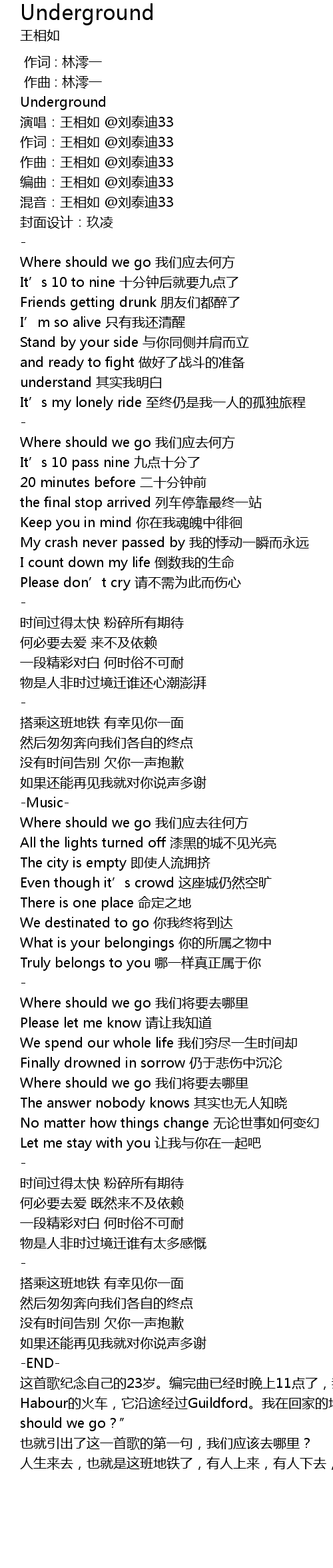 | [01:47.275] | 这首歌纪念自己的23岁。编完曲已经时晚上11点了,我要从伦敦的ICMP音乐学院回吉尔福德的家,坐jubilee线到waterloo火车站,然后在13站台坐去Portsmoth Habour的火车,它沿途经过Guildford。我在回家的地铁上,看到了几个女孩子上车,声音很明媚,她们说,“where should we go?” 也就引出了这一首歌的第一句,我们应该去哪里? 人生来去,也就是这班地铁了,有人上来,有人下去,我们向着各自的终点飞驰而去,谢谢你曾与我同行。 |