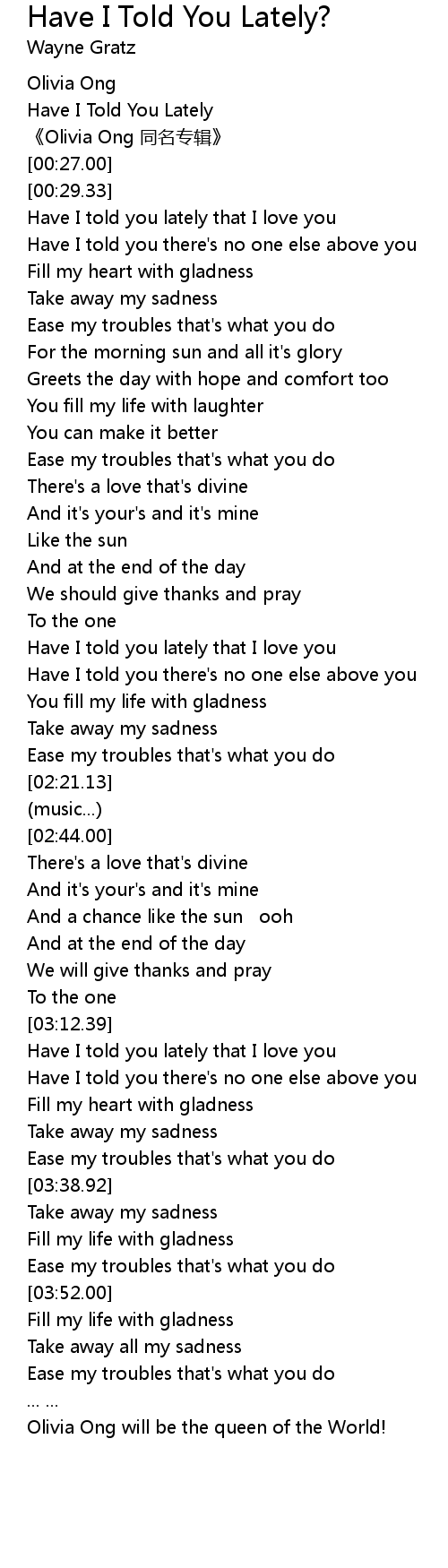 | [00:12.70] | Have I Told You Lately |