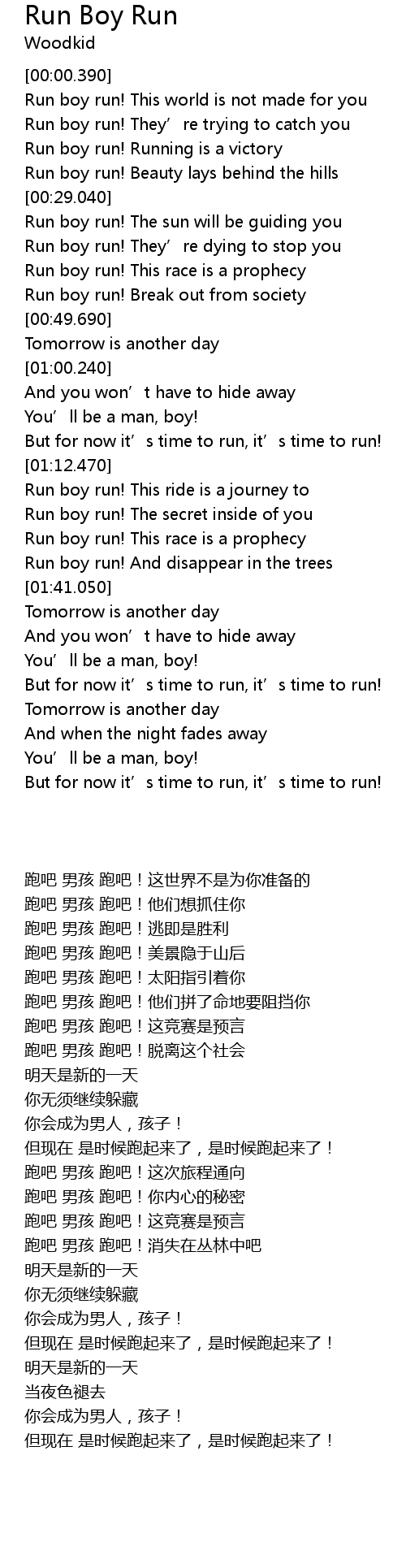 | [00:18.100] | Run boy run! They’re trying to catch you |