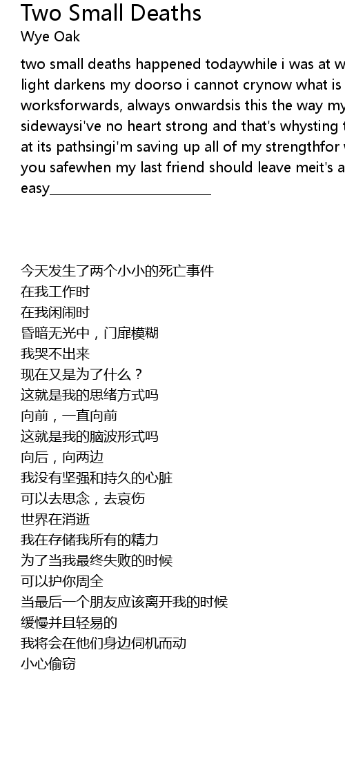 | two small deaths happened todaywhile i was at workwhile i was at playa vast light darkens my doorso i cannot crynow what is that for?is this the way my mind worksforwards, always onwardsis this the way my brain waitsbackwards, sidewaysi've no heart strong and that's whysting to miss and to mournlove, wild at its pathsingi'm saving up all of my strengthfor when i finally failat keeping you safewhen my last friend should leave meit's alright, easy__________________________ |