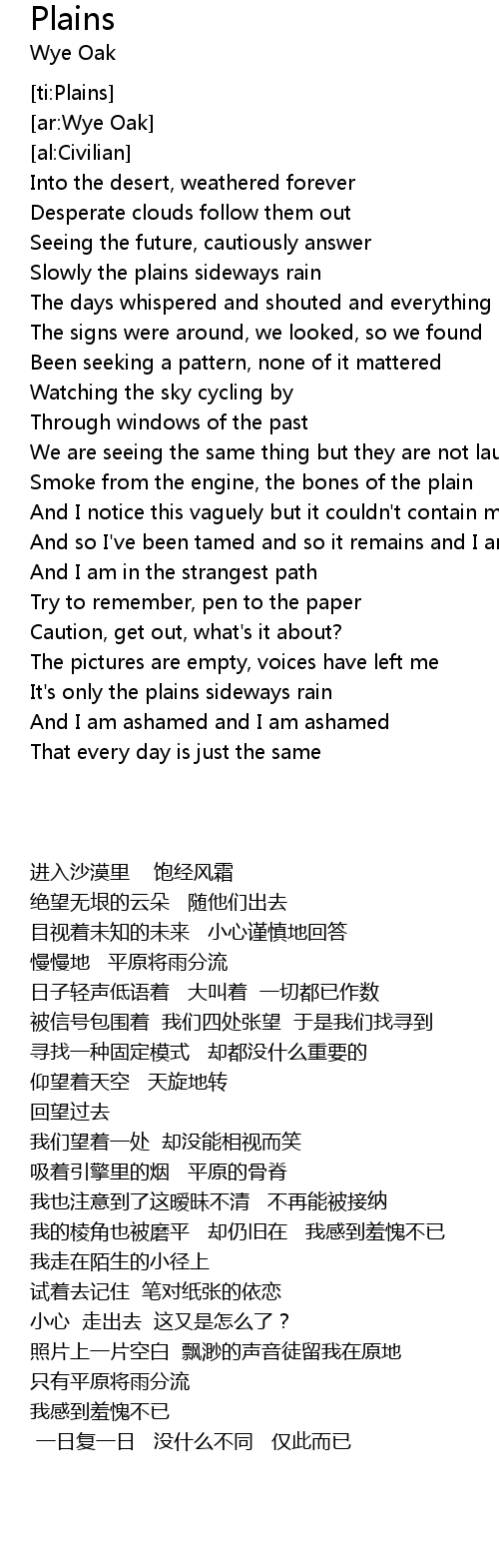 | [02:02.89] | Smoke from the engine, the bones of the plain |