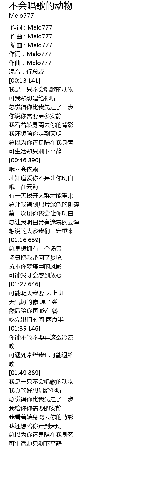 | [00:15.891] | 我是一只不会唱歌的动物 |