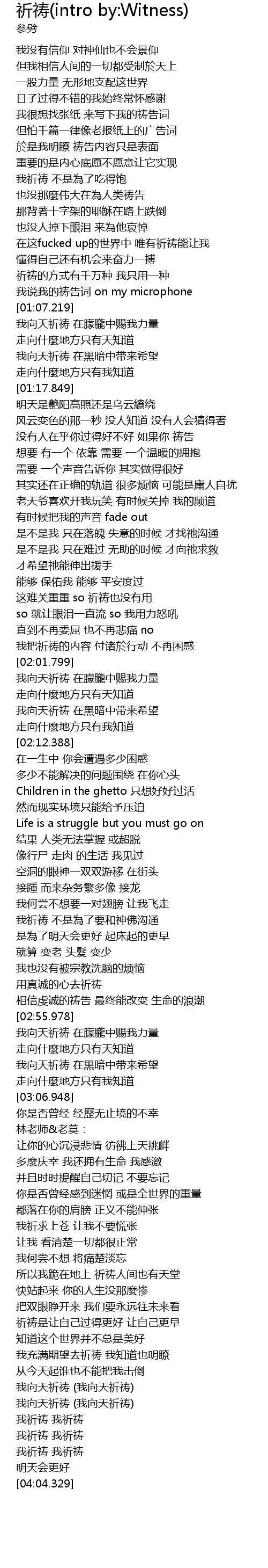 | [01:05.900] | 我说我的祷告词 on my microphone |