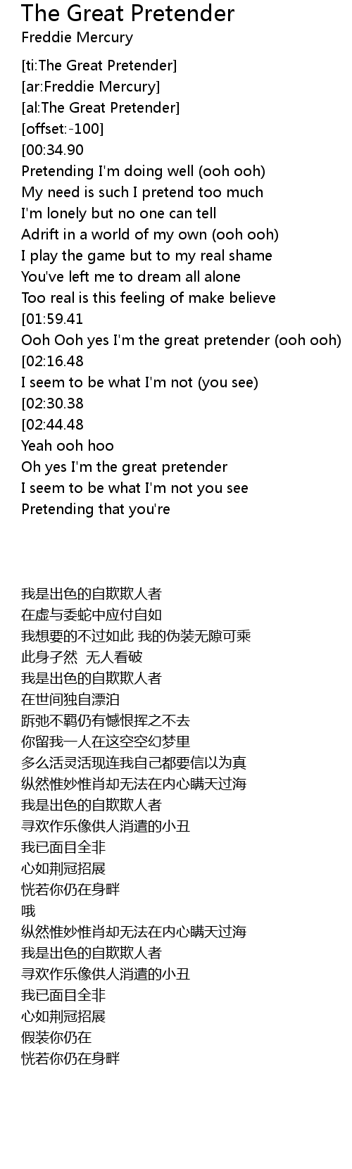 [00:07.19][00:34.90] Oh yes I'm the great pretender (ooh ooh)