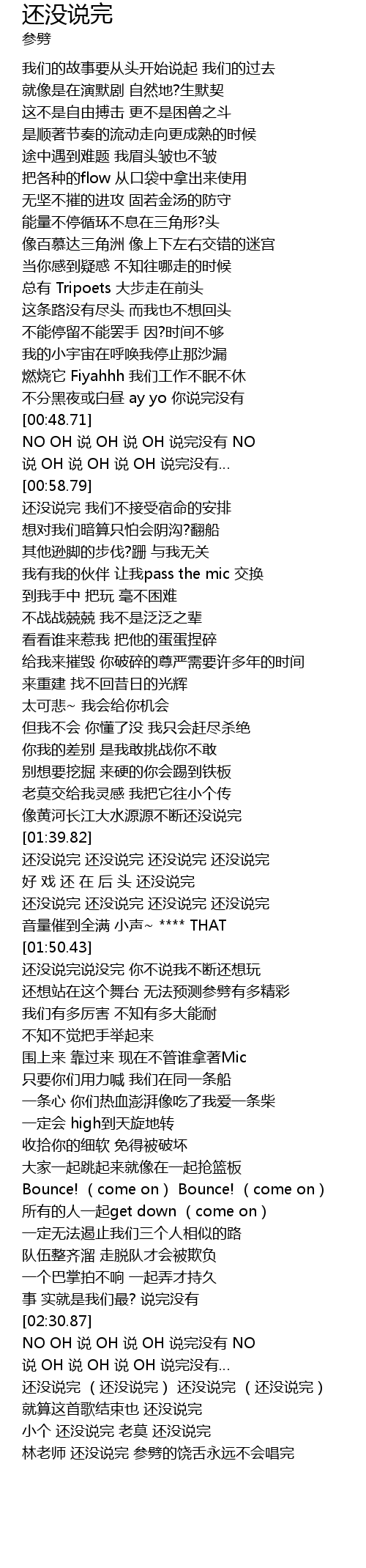 | [02:48.53] | 林老师 还没说完 参劈的饶舌永远不会唱完 |