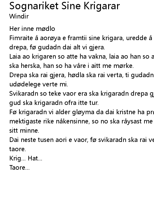 | Fimraite å aorøya e framtii sine krigara, uredde å stålte e rai klar ti å drepa, fø gudadn dai alt vi gjera. | |