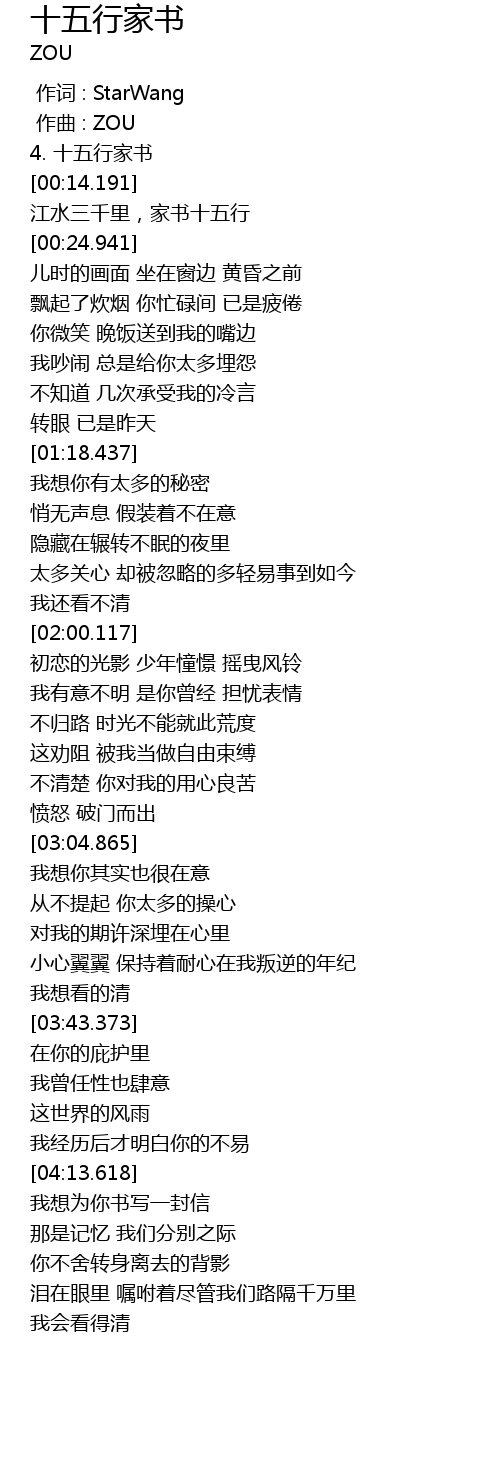 | [00:14.440] | jiāng shuǐ sān qiān lǐ, jiā shū shí wǔ xíng |