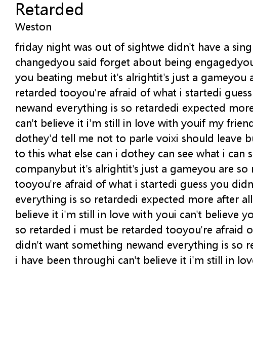 friday night was out of sightwe didn't have a single fightsaturday it totally changedyou said forget about being engagedyou can see what i can seewhen i see you beating mebut it's alrightit's just a gameyou are so retarded i must be retarded tooyou're afraid of what i startedi guess you didn't want something newand everything is so retardedi expected more after all i have been throughi can't believe it i'm still in love with youif my friends only knew what you dothey'd tell me not to parle voixi should leave but my damn love wonti'm so use to this what else can i dothey can see what i can seewhen you're in my companybut it's alrightit's just a gameyou are so retarded i must be retarded tooyou're afraid of what i startedi guess you didn't want something newand everything is so retardedi expected more after all i have been throughi can't believe it i'm still in love with youi can't believe you are so retardedyou are so retarded i must be retarded tooyou're afraid of what i startedi guess you didn't want something newand everything is so retardedi expected more after all i have been throughi can't believe it i'm still in love with you |