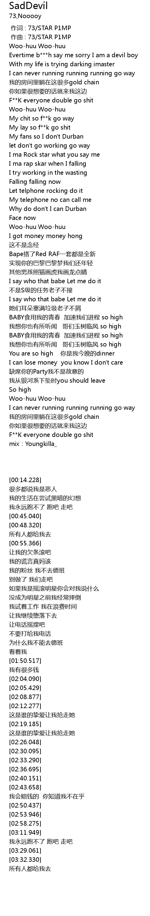 | [00:27.526] | Evertime b***h say me sorry I am a devil boy |