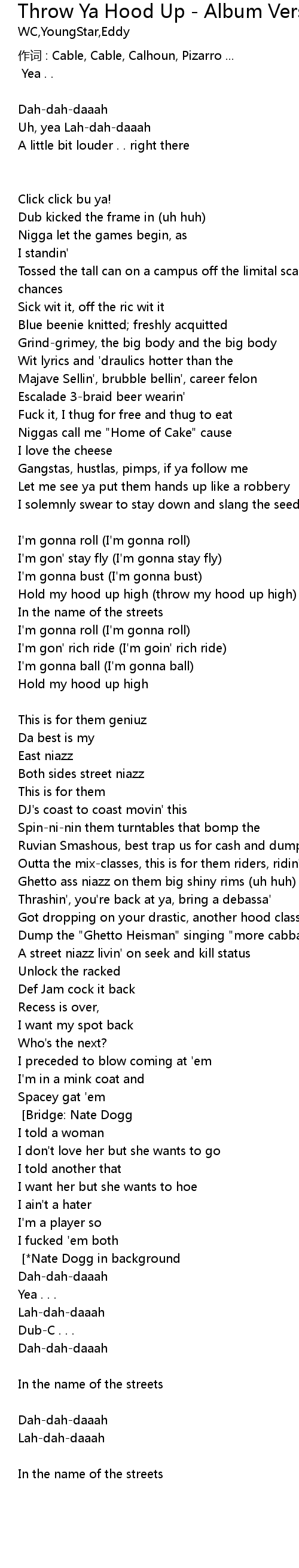| I spit in the name of the streets [Chorus: Nate Dogg + W.C.] | |