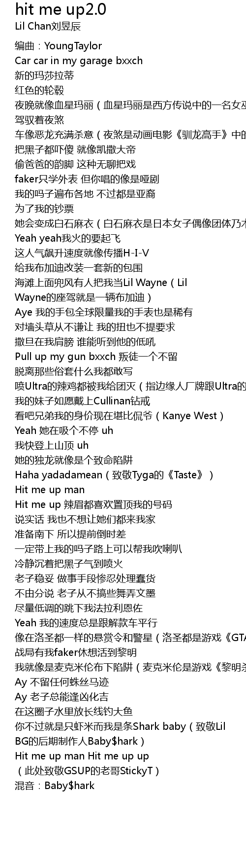 | [02:13.40] | 你不过就是只虾米而我是条Shark baby(致敬Lil BG的后期制作人Baby$hark) |