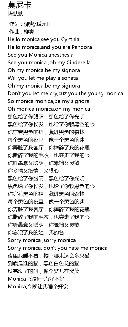 | [04:50.158] | Monica, jīn wǎn ràng wǒ shuì gè hǎo jué |