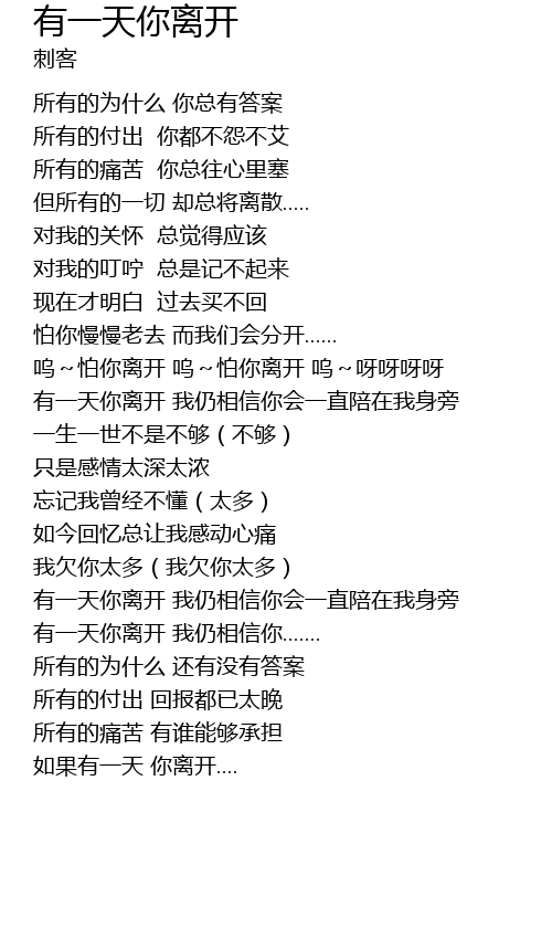 | [02:08.280] | 有一天你离开 我仍相信你会一直陪在我身旁 |