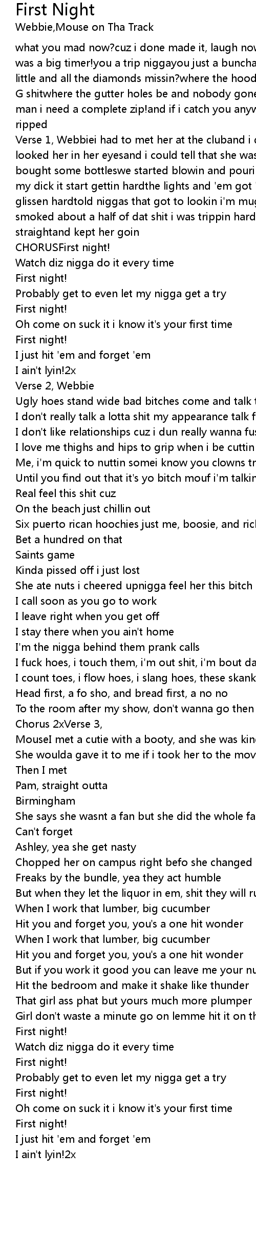 Verse 1, Webbiei had to met her at the cluband i didn't even know heri just looked her in her eyesand i could tell that she was soberthat's a problem, bought some bottleswe started blowin and pourinshe got to bouncin and twerkin, my dick it start gettin hardthe lights and 'em got 'em movin my shit it start glissen hardtold niggas that got to lookin i'm muggin them bitches hardalready smoked about a half of dat shit i was trippin hardso i made sure my niggaz was straightand kept her goin |