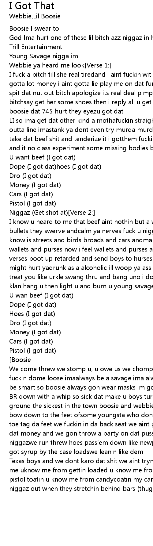 I know u heard to me that beef aint nothin but a word ya heard i creep and serve bullets they swerve andcalm ya nerves fuck u nigga i aint throwin no slurs all i know is streets and birds broads and cars andmalls big splurgin i used to steal wallets and purses now i feel wallets and purses all the real niggazwhile off my verses boot up retarded and send boys to hurses dont get me started cause boy i might hurt yadrunk as a alcoholic ill woop ya ass purple slap ya and kick ya and treat you like urkle swang thru and bang uno i dont think u heard me ku klux klan hang u then light u and burn u young savage what u wan do nigga[Chorus] |